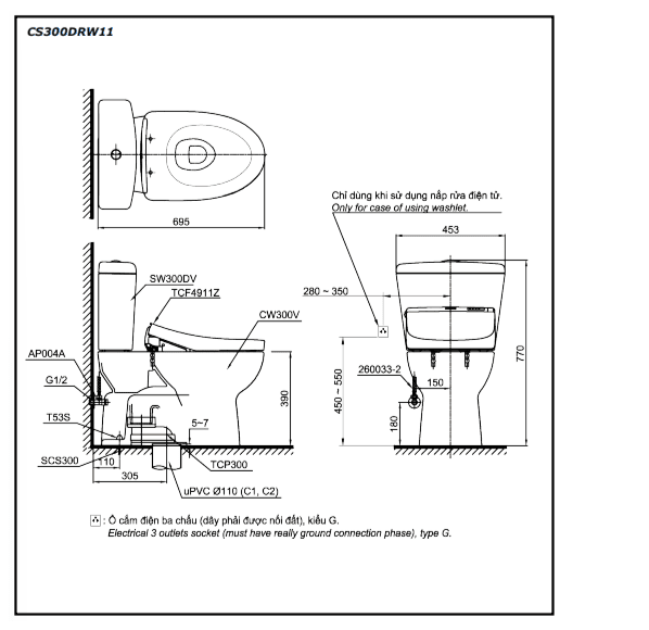 Bản vẽ Bồn Cầu Điện Tử TOTO Bồn Cầu Điện Tử TOTO CS300DRW11#W Kèm Nắp Rửa Điện Tử WASHLET Dòng S7 – TCF4911Z