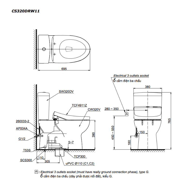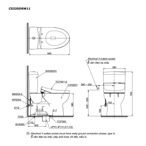 Bản vẽ Bồn Cầu Điện Tử TOTO CS320DRW11#W Kèm Nắp Rửa Điện Tử WASHLET Dòng S7 – TCF4911Z