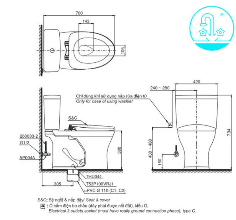 - Loại: Bồn cầu 2 khối nắp rửa điện tử WASHLET