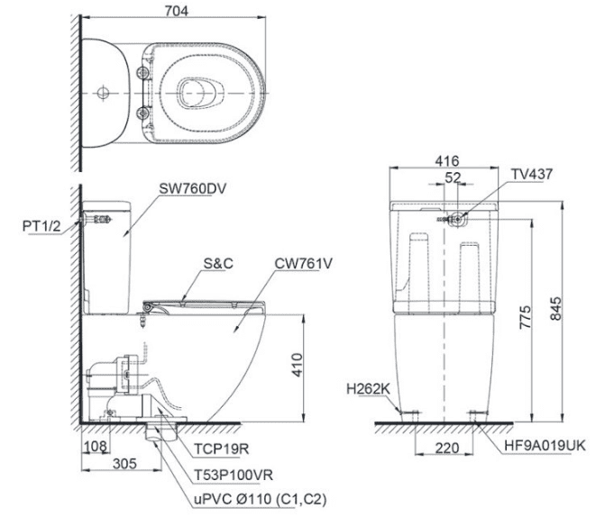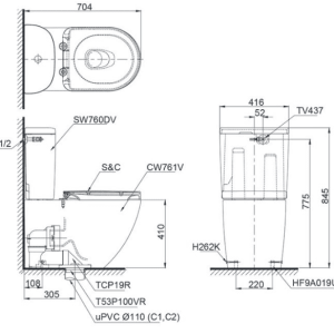 Bản vẽ kỹ thuật Bồn Cầu Điện Tử TOTO CS761DW5#XW Kèm Nắp Rửa Điện Tử WASHLET Dòng S7 – TCF4732A (220V)