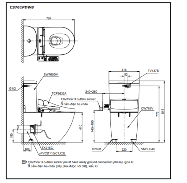 Bản vẽ Bồn Cầu Điện Tử TOTO CS761PDW8#XW Kèm Nắp Rửa Điện Tử WASHLET Dòng C2