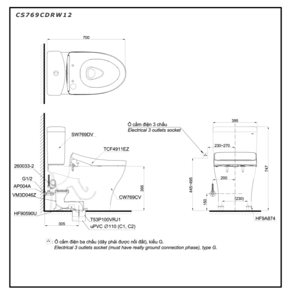 Bản vẽ Bồn Cầu Điện Tử TOTO CS769CDRW12#XW Kèm Nắp Rửa Điện Tử WASHLET Dòng S7