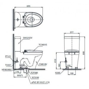 Bản vẽ kỹ thuật Bồn cầu điện tử TOTO CS818DW11#XW
