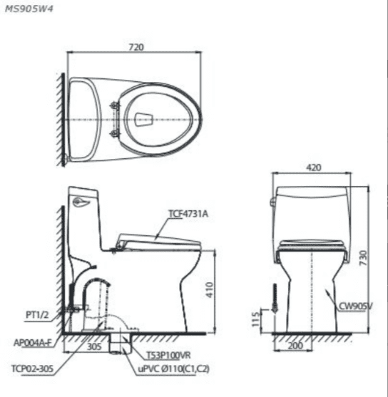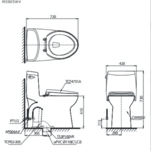 Bản vẽ kỹ thuật Bồn cầu điện tử TOTO MS905W6#XW