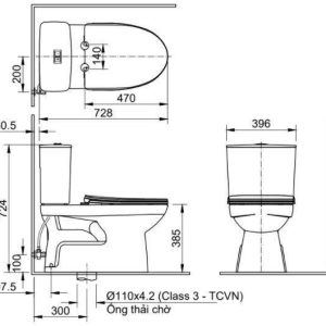 - Kích thước bồn cầu: 728 x 396 x 724 mm (Dài x Rộng x Cao)