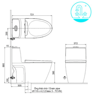 - Kích thước bồn cầu: 721 x 372 x 680 mm