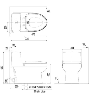 - Kích thước bồn cầu: 736 x 394 x 650 mm (dài x rộng x cao)