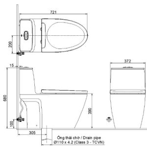 - Kích thước bồn cầu: 721 x 372 x 680 mm (Dài x Rộng x Cao)