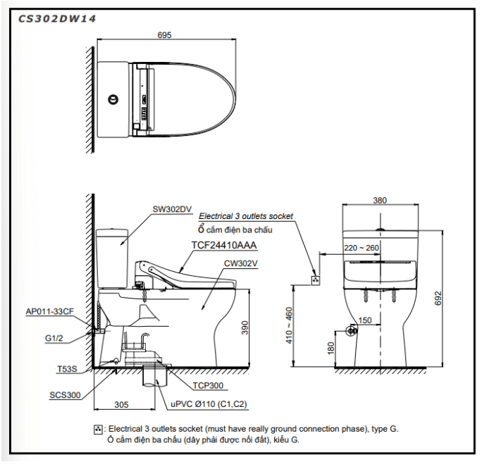 - Bồn Cầu TOTO CS302DW14#W được trang bị Nắp Rửa Điện Tử WASHLET dòng C5 TCF24410AAA với nhiều tính năng hiện đại