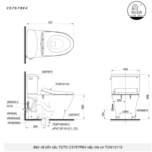 Thông số kỹ thuật Bồn Cầu TOTO CS767RE4#XW 2 Khối Nắp Rửa Cơ TCW1211A