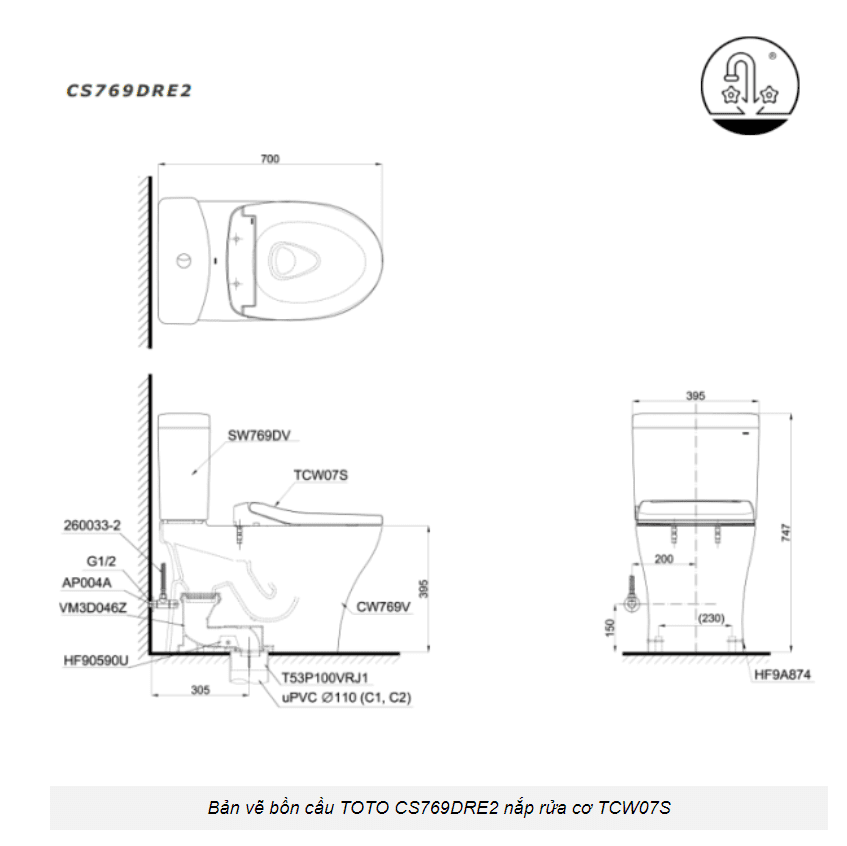 Thông số kỹ thuật Bồn cầu TOTO CS769DRE2#XW 2 khối nắp rửa cơ TCW07S