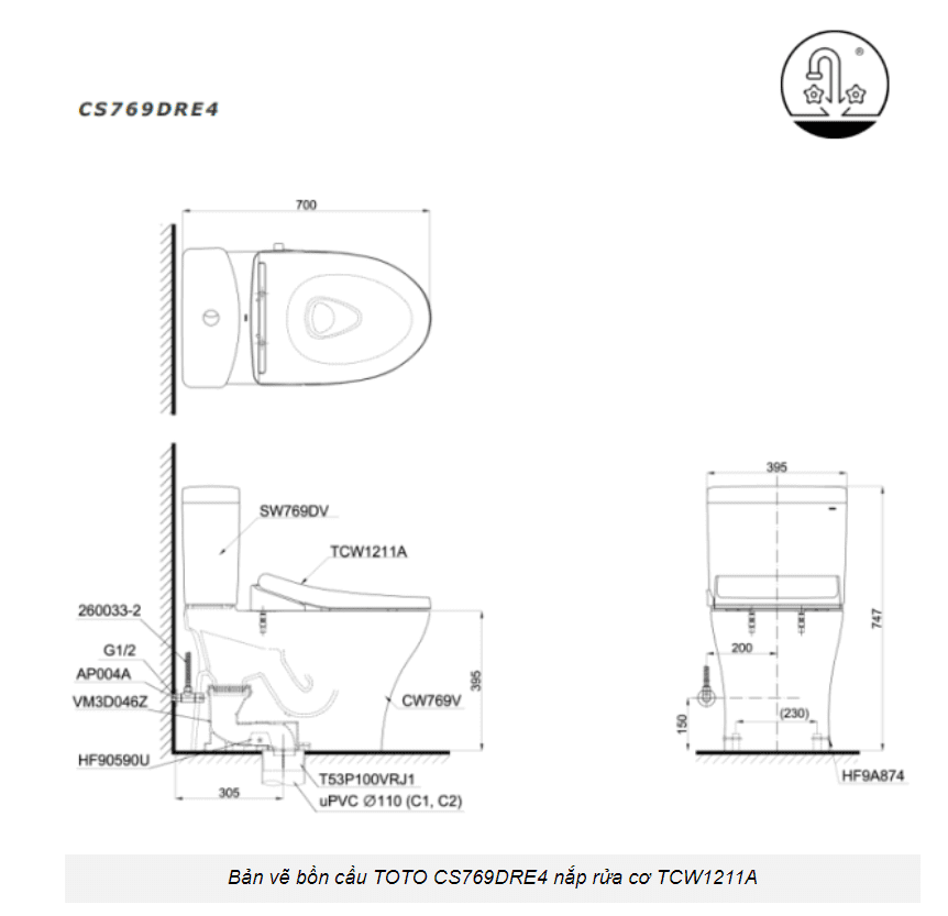 Bản vẽ kỹ thuật Bồn cầu 2 khối TOTO CS769DRE4#XW nắp rửa cơ TCW1211A