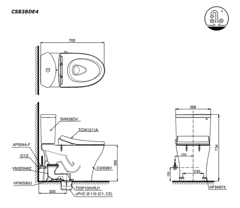 Thông số kỹ thuật Bồn cầu TOTO CS838DE4#XW 2 khối nắp rửa cơ TCW1211A