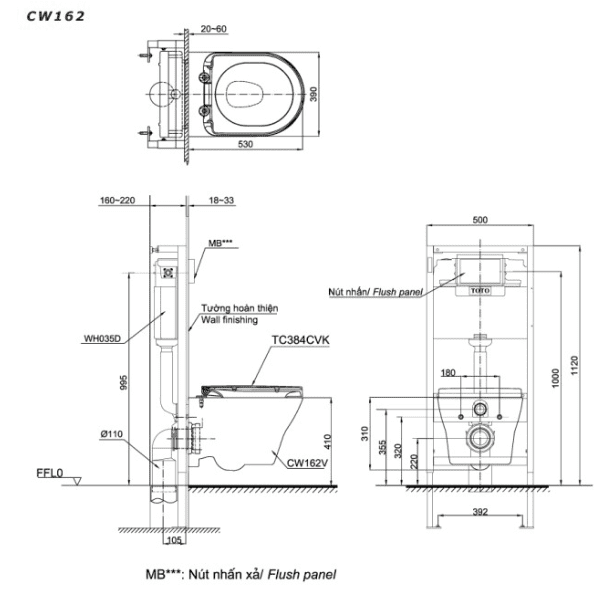 Bản vẽ Bồn Cầu TOTO CW162#XW/TC384CVK#W Treo Tường