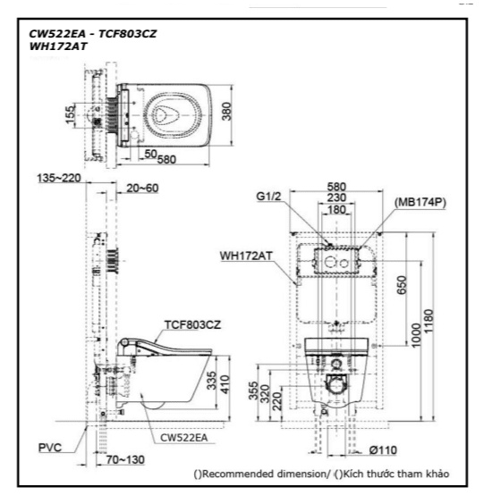 - WH172AAT: Két nước dành cho bàn cầu treo tường giấu dây, có chức năng tự động xả