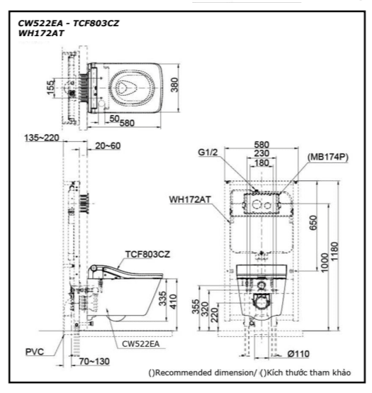 - bao gồm WH172AAT: Két nước dành cho bàn cầu treo tường giấu dây, có chức năng tự động xả
