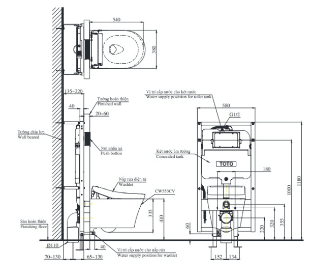 - Bồn Cầu TOTO CW553C#XW/TCF34570GAA#NW1/WH172AAT Treo Tường là sản phẩm bồn cầu treo tường TOTO dáng chữ D, loại giấu dây