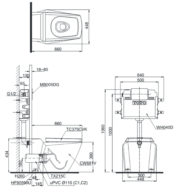 Bản vẽ Bồn Cầu TOTO CW681#XW/TCP06/T53P100VR/TC375CVK#W Treo Tường