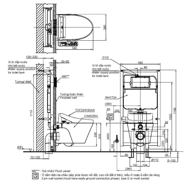 - Bồn cầu treo tường kết hợp với nắp êm , chưa bao gồm két nước âm tường và nút nhấn