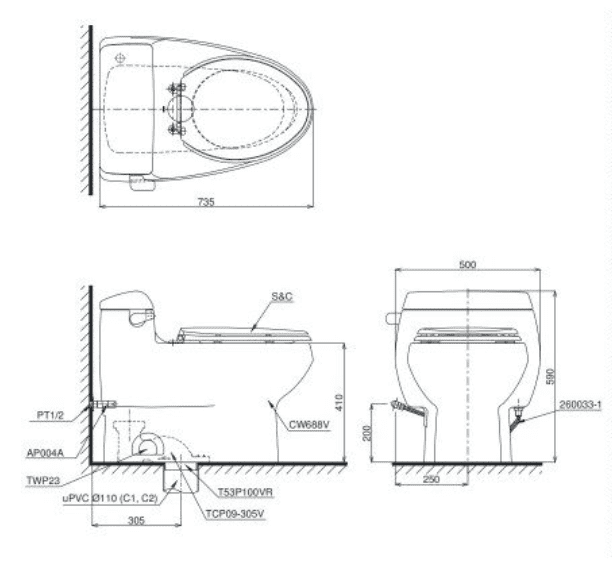 - Sau đây là bản vẽ của bàn cầu TOTO này giúp bạn dễ dàng lắp đặt ngay tại nhà