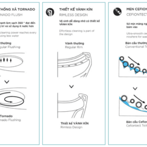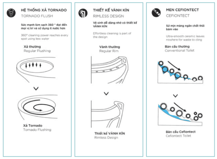 • Công nghệ CeFiONtect ứng dụng cho lòng bàn cầu giúp bề mặt luôn trơn láng, ngăn chất thải và vi khuẩn bám dính, từ đó kéo dài thời gian giữa các lần làm sạch.