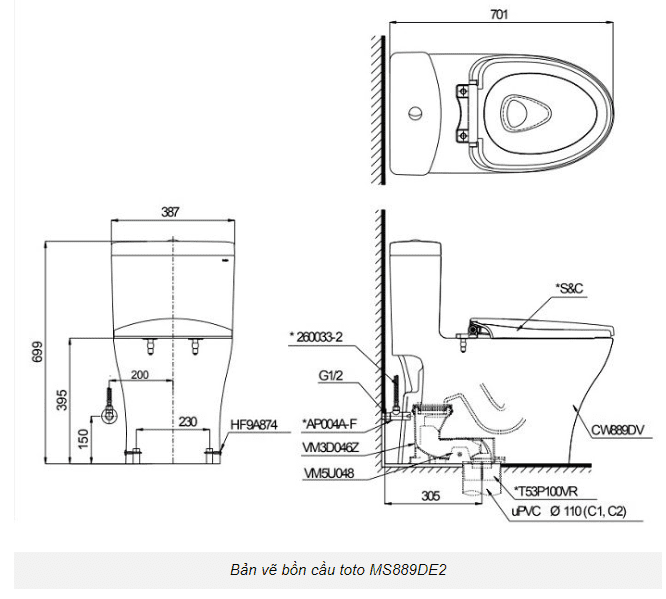 Bản vẽ kỹ thuật Bồn cầu TOTO MS889DRE2#XW 1 khối nắp rửa cơ TCW07S
