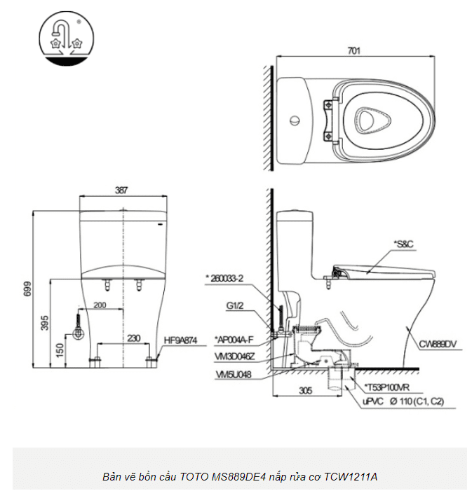 Bản vẽ kỹ thuật Bồn cầu TOTO MS889DRE4#XW 1 khối nắp rửa cơ TCW1211A