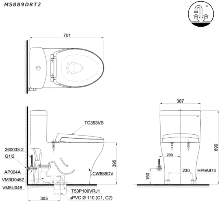 Thông số kỹ thuật Bồn Cầu TOTO MS889DRT2#XW 1 Khối Nắp Đóng Êm TC393VS