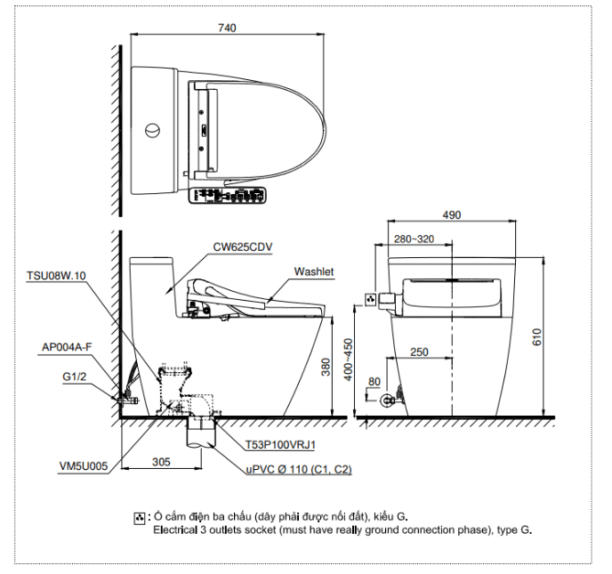 Bản vẽ Bồn Cầu WASHLET TOTO MS625CDW12#XW 1 Khối Kèm Nắp Điện Tử