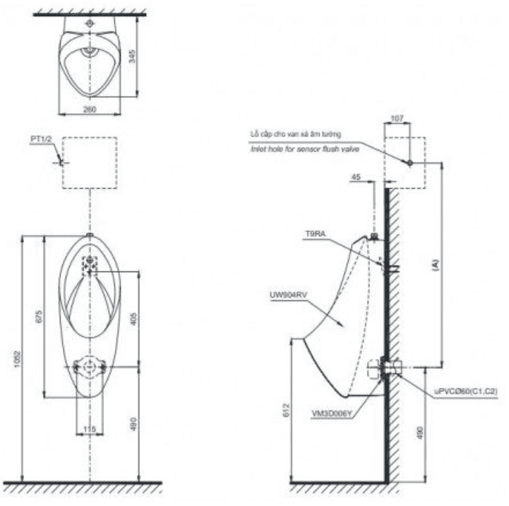 bản vẽ kỹ thuật của sản phẩm Bồn tiểu TOTO UT904R
