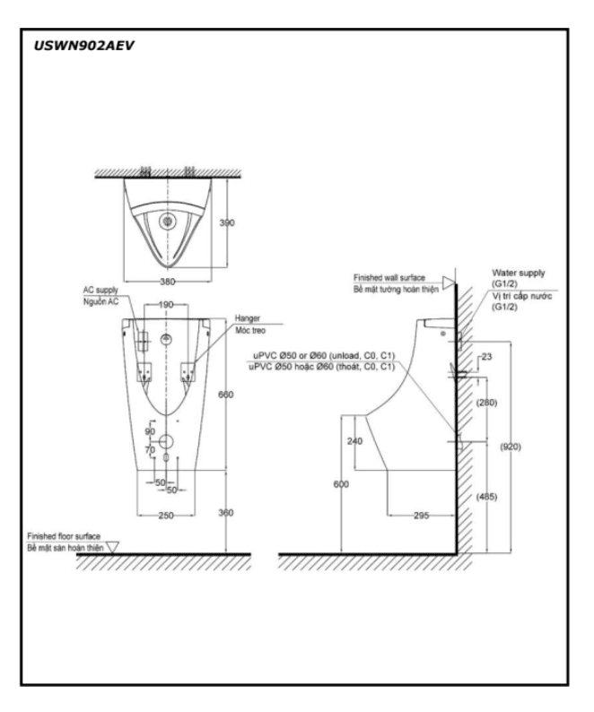 Bản vẽ Bồn Tiểu Nam Treo Tường TOTO USWN902AEV#XW