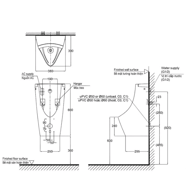 - Thiết kế bồn tiểu không góc khuất giúp dễ dàng chà rửa và vệ sinh.