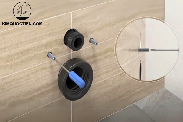 Sau khi bắt giá đỡ, hãy tiến hành lắp đặt gioăng cao su vào giữa ống xả và đường ống xả của két nước âm tường. Lưu ý, để tránh tình trạng rò rỉ nước sau khi lắp, bạn cần tháo các lớp mút bảo vệ các vị trí này rồi bọc keo chuyên dụng để tạo ra một lớp đệm kín khít. Sau đó, lắp gioăng cao su vào.
