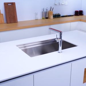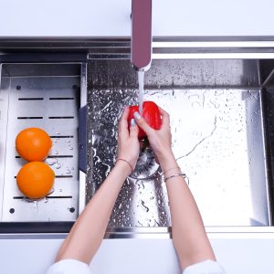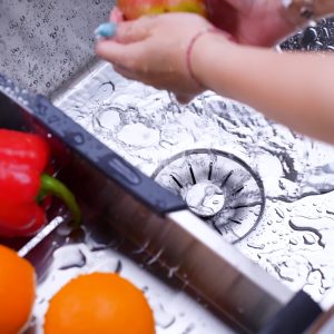 Điểm nổi bật của chậu là gờ hạ bậc SLIDE thông minh, cho phép các phụ kiện như giá đỡ, khay rửa, thớt di chuyển linh hoạt, tối ưu hóa không gian và hiệu quả sử dụng. Chậu có thể lắp đặt âm, dương hoặc bán âm, đi kèm nhiều phụ kiện bếp tiện ích như thớt gỗ, rổ VY và khay VY, giúp công việc bếp núc trở nên nhẹ nhàng hơn.