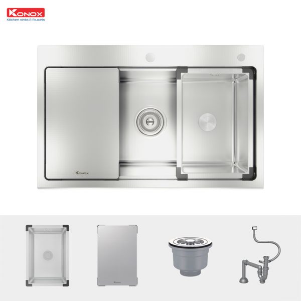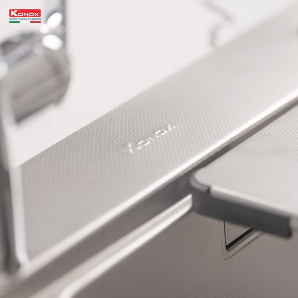 Ngoài ra, chậu còn được trang bị tấm chống ồn ở mặt sau làm từ cao su tổng hợp dày 3mm, giúp giảm thiểu tiếng ồn khi xả nước hoặc va chạm. Lớp sơn phủ chống thấm ngược chất lượng cao ở mặt sau chậu ngăn ngừa hiện tượng ngưng tụ nước. Tay thoát tràn được thiết kế vuông hiện đại, giúp tăng tốc độ xả nước lên đến 30%. Bộ sản phẩm còn bao gồm một thớt inox tiện lợi, có thể dễ dàng trượt trên gờ hạ bậc, và một chậu rửa nhỏ hơn để phục vụ nhu cầu rửa ít. Để tránh mua phải hàng giả, quý khách nên lưu ý logo Konox được in nổi trên chậu và tem bảo hành điện tử đi kèm. Sản phẩm được bảo hành chính hãng 10 năm cho chậu rửa và 3 năm cho hệ thống ống xả.