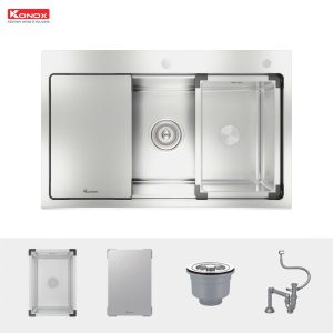 Chậu Rửa Chén KONOX KN8151TS Dekor Chống Xước Inox 1 Hộc thuộc dòng Dekor Series cao cấp của thương hiệu Konox Việt Nam, nổi tiếng với các sản phẩm nhà bếp chất lượng và thiết kế thông minh. Sản phẩm này được thiết kế để tối ưu hóa trải nghiệm người dùng trong căn bếp hàng ngày, đặc biệt chú trọng khả năng chống trầy xước và tích hợp các phụ kiện tiện lợi, biến chậu rửa bát thông thường thành một trung tâm sơ chế đa năng, mang đến sự hiện đại và tiện nghi cho không gian bếp của bạn.