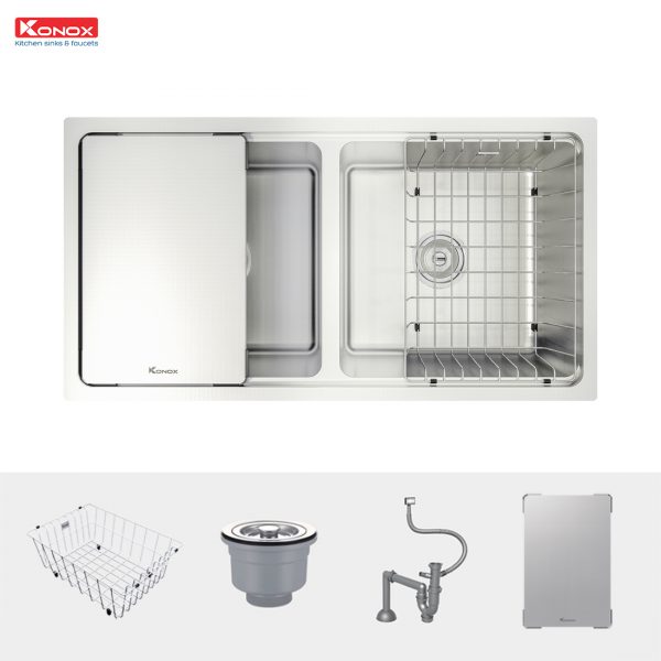 Điểm nổi bật của các mẫu thiết bị nhà bếp Konox là thiết kế gờ hạ bậc độc đáo, tích hợp các phụ kiện thông minh đi kèm như siphon, giá úp bát inox và thớt inox. Bạn có thể dễ dàng thực hiện các thao tác sơ chế thực phẩm ngay trên chậu, tiết kiệm không gian và thời gian.