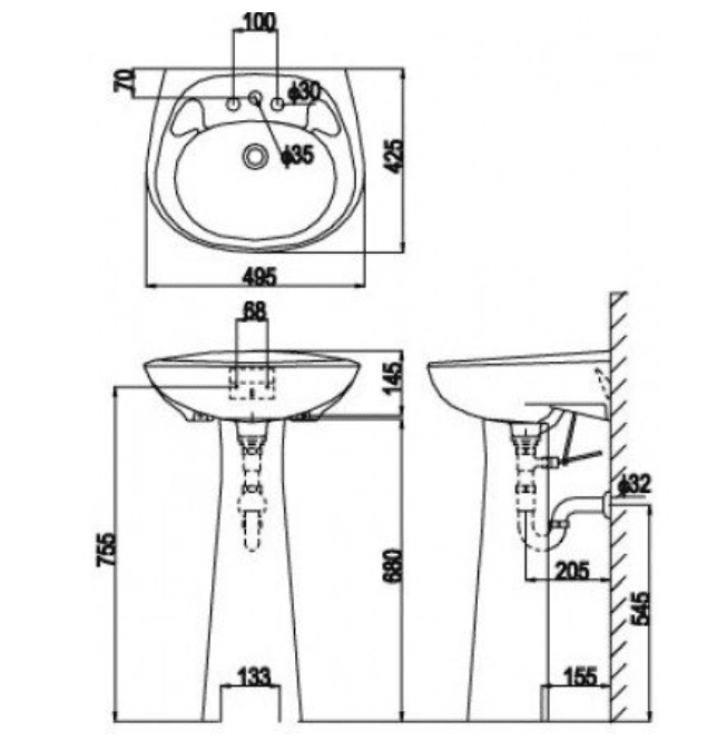 Bản vẽ kỹ thuật của chậu 284 INAX kèm chân L284VD