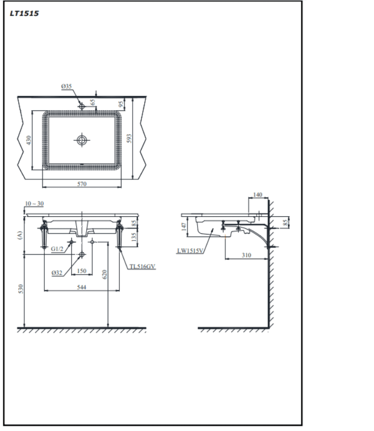 Bản vẽ Chậu Rửa Mặt Lavabo TOTO LT1515#XW Âm Bàn