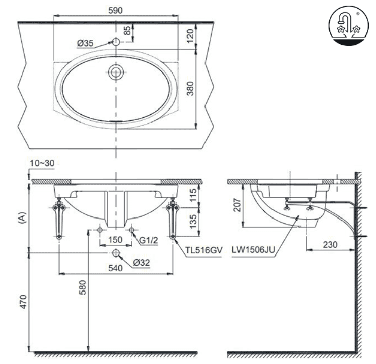 Bản vẽ kĩ thuật lavabo TOTO LW1506V âm bàn