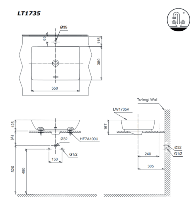 Lỗ đặt vòi Ø35 được thiết kế theo tiêu chuẩn quốc tế, có thể kết hợp được với các mẫu vòi chậu lạnh hoặc nóng lạnh như: TLG 01307V, TLG 02307V, TLG 03305V, TLG 07305V, TLG 08305V, TLG 09305V,…
