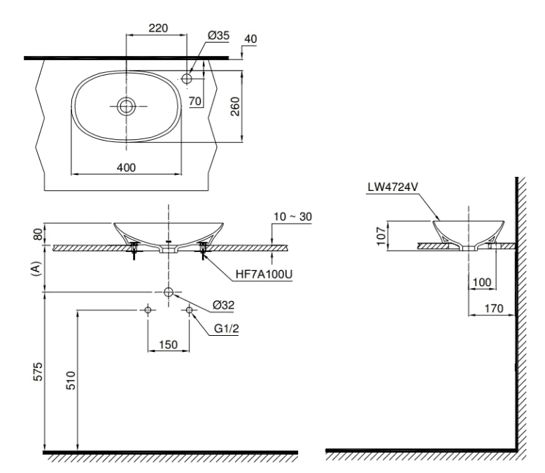 Bản vẽ chậu rửa mặt Lavabo TOTO LT4724 Đặt Bàn