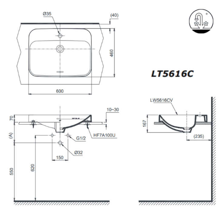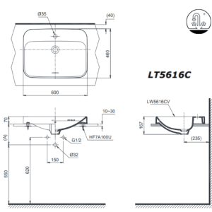 Bản vẽ chậu rửa lavabo TOTO LT5616C đặt bàn