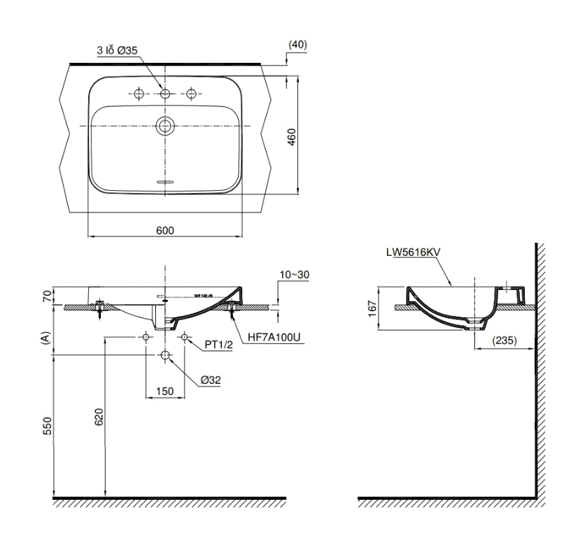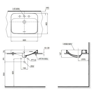 Bản vẽ Chậu Rửa Mặt TOTO LT5616#XW Đặt Bàn 3 Lỗ