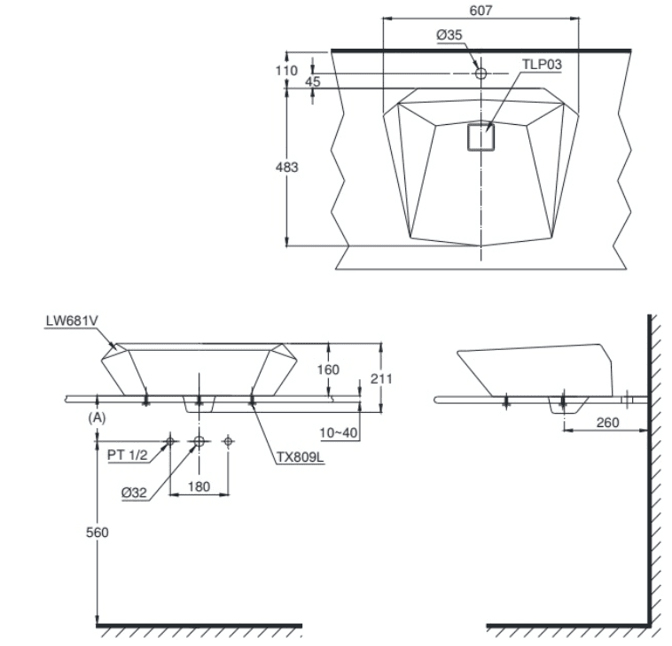 Bản vẽ chậu rửa mặt Lavabo TOTO LT681 đặt bàn