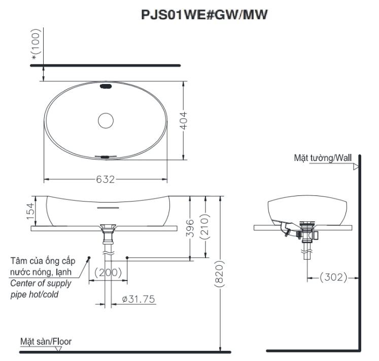 Bản vẽ kỹ thuật chậu rửa mặt Lavabo TOTO PJS01WE đặt bàn