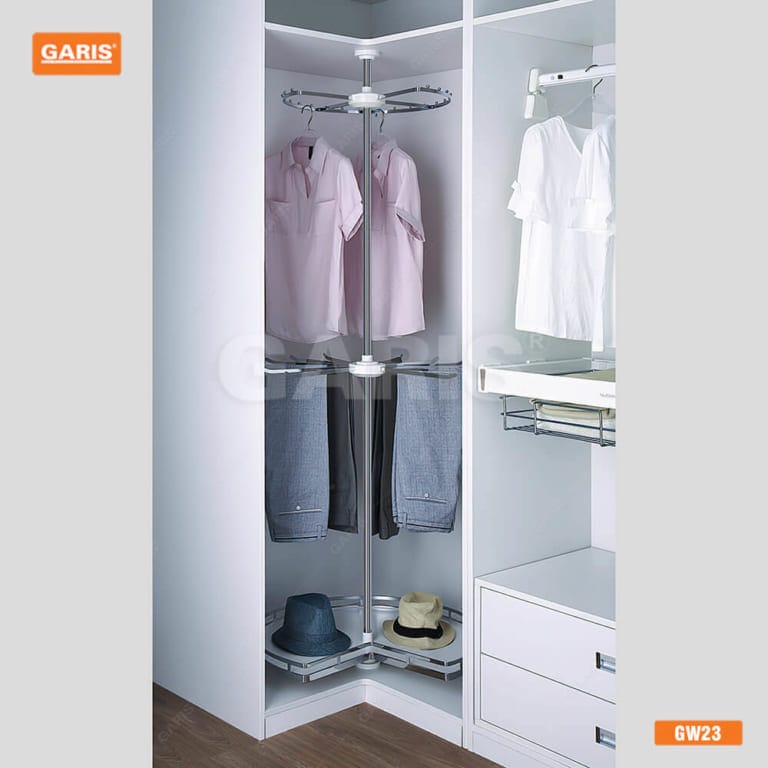 - Tận dụng tối đa góc chết tủ quần áo: Giá xoay GW23 có thiết kế hình 3/4, giúp bạn tận dụng hiệu quả không gian góc tủ thường bị bỏ trống.