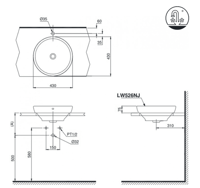- Đường kính lỗ bắt vòi: Ø35 (mm)