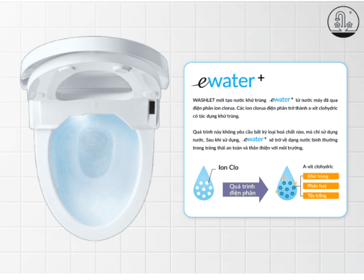- Công nghệ Ewater phun sương điện phân được kích hoạt sau mỗi lần sử dụng, làm sạch vòi rửa và lòng bàn cầu, ngăn vi khuẩn sinh sôi mà không cần dùng thêm hóa chất tẩy rửa.
