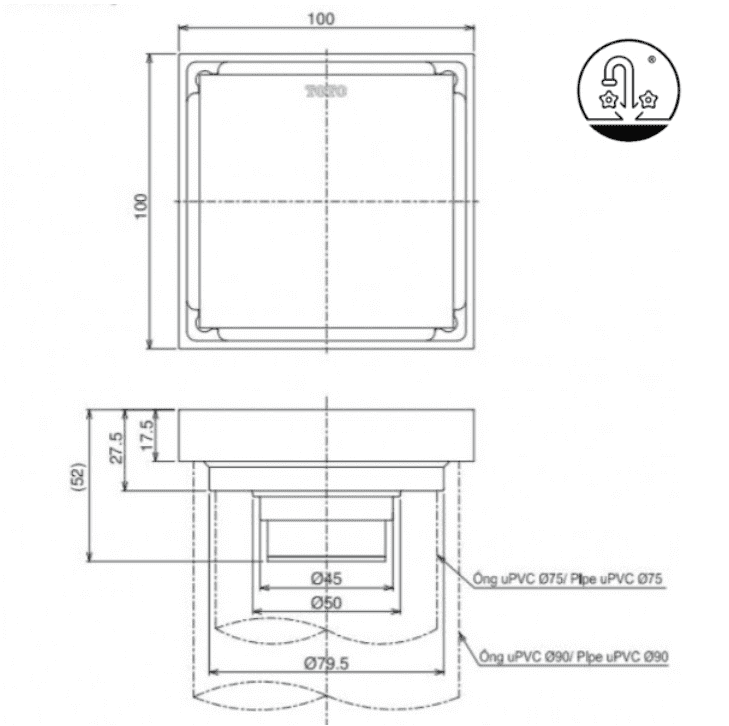 - Vẫn có thể dùng ống thoát phi 90mm nhưng đề xuất là phi 60 mm